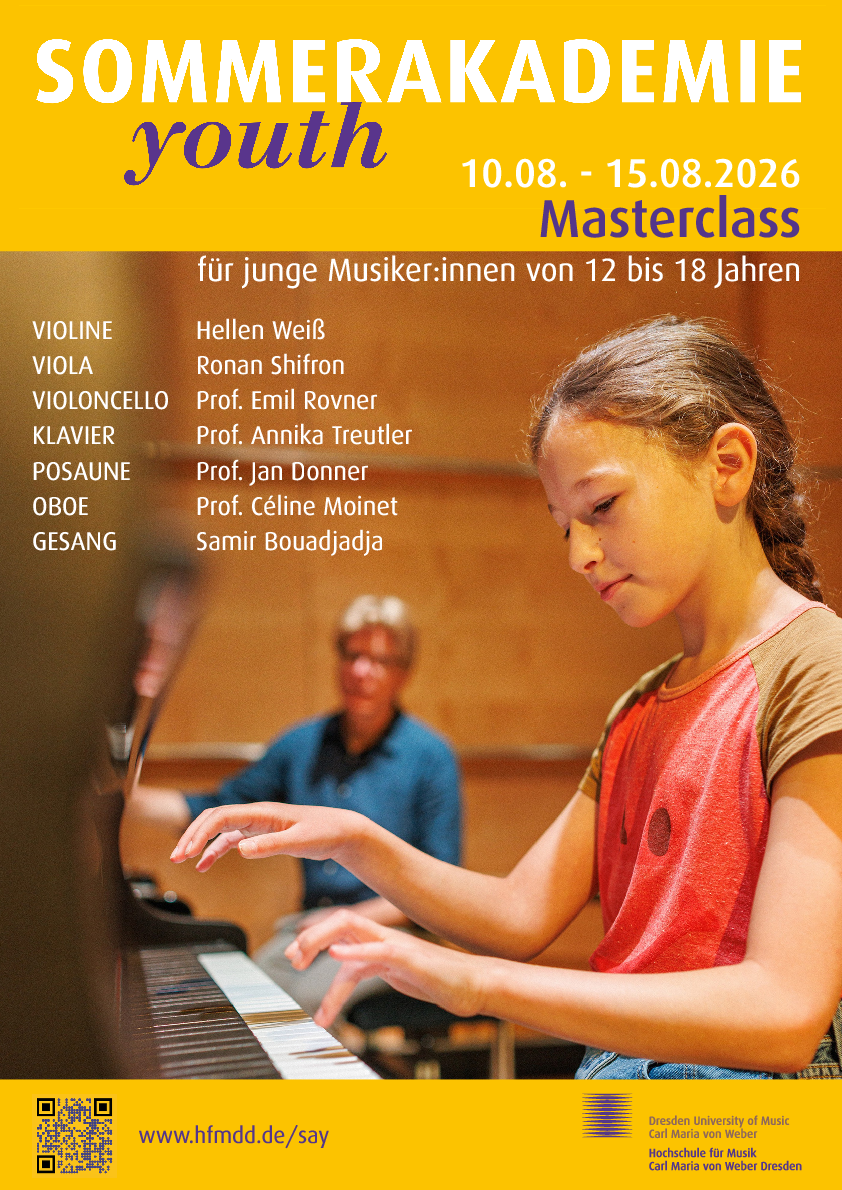 Vom 10. bis 15. August 2026 lädt die Hochschule für Musik Dresden zur Sommerakademie Youth ein. Euch erwartet eine intensive und inspirierende Musikwoche.