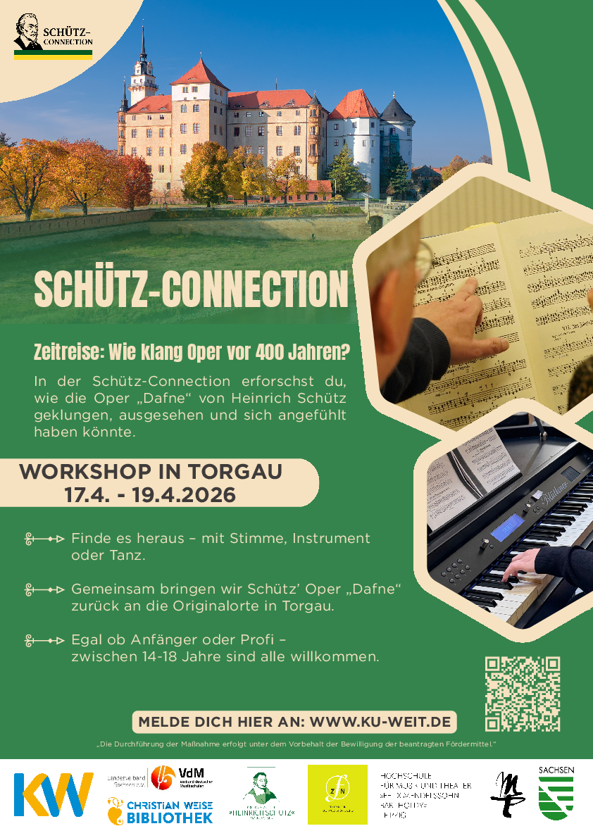 Torgau ist ein Schlüsselort der deutschen Musikgeschichte. Im Schloss Hartenfels erklang 1627 Heinrich Schütz’ „Dafne“ – eines der ersten Werke des deutschsprachigen Musiktheaters. Die Musik selbst ist verloren, erhalten sind das Libretto von Martin Opitz und der originale Aufführungsraum. Genau hier setzt die Schütz-Connection an: Gemeinsam begeben sich die Teilnehmenden auf eine musikalische Spurensuche. Aus Fragmenten, zeitgenössischen Tanz- und Instrumentalmusiken sowie vergleichbaren Werken entsteht eine experimentelle Rekonstruktion – keine „fertige Oper“, sondern ein lebendiger Annäherungsprozess.